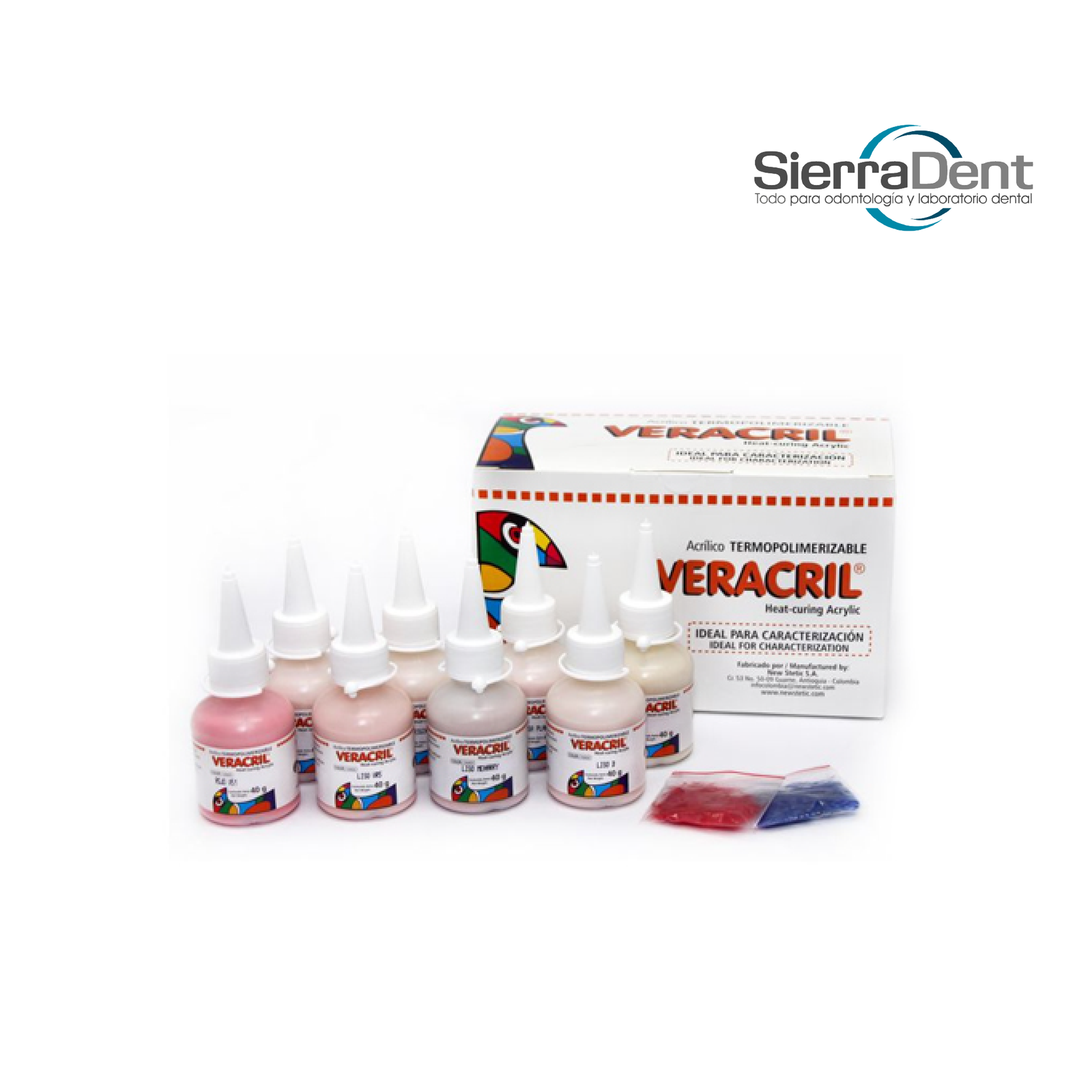 Kit de caracterización compuesto por 8 colores termo curados en presentación de 40g cada uno. Ideal para dar realismo y detalles personalizados en prótesis dentales.